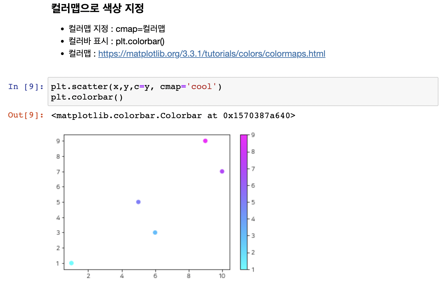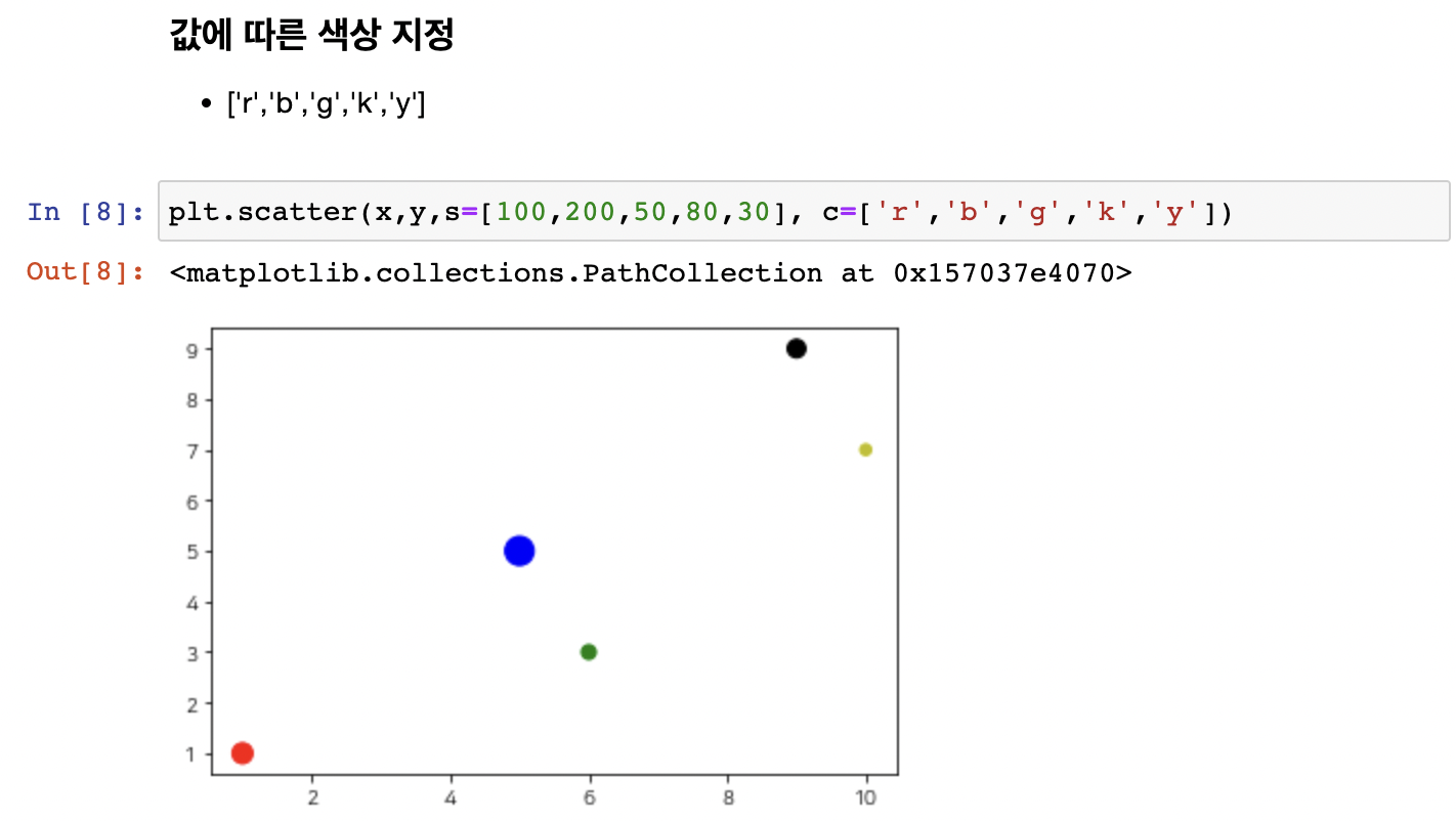 plt.scatter()의 파라미터 c로 점 색상을 지정한다.