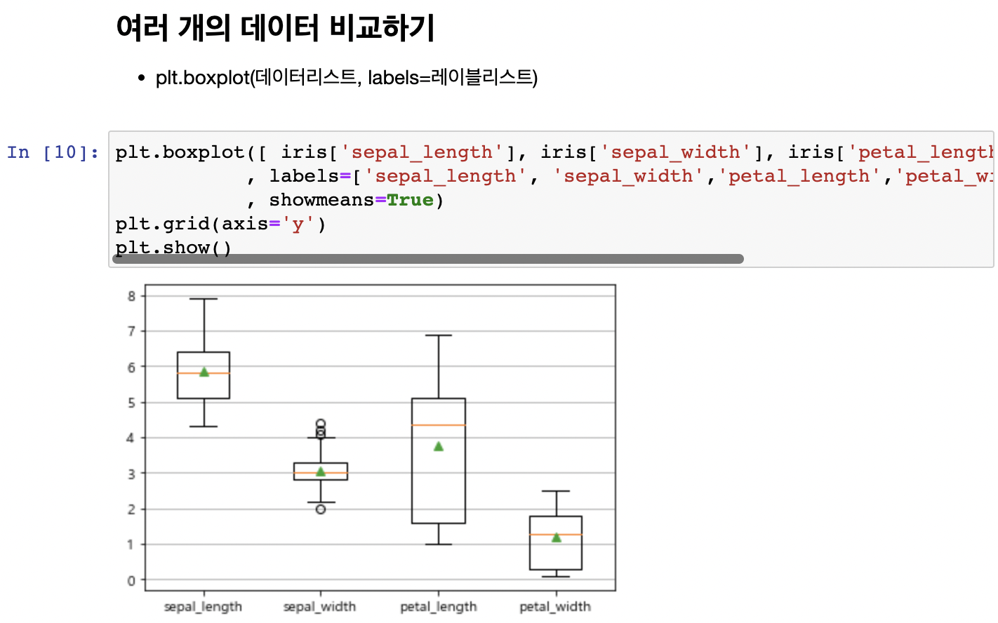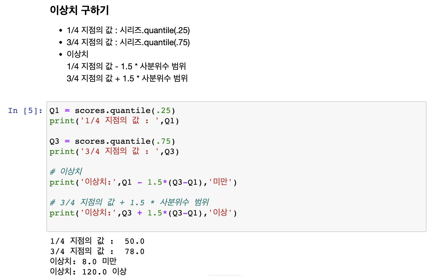 · 어떤 값이 (3/4 지점의 값 + 1.5 * 사분위수 범위) 보다 크면 그 값을 이상치로 정한다.