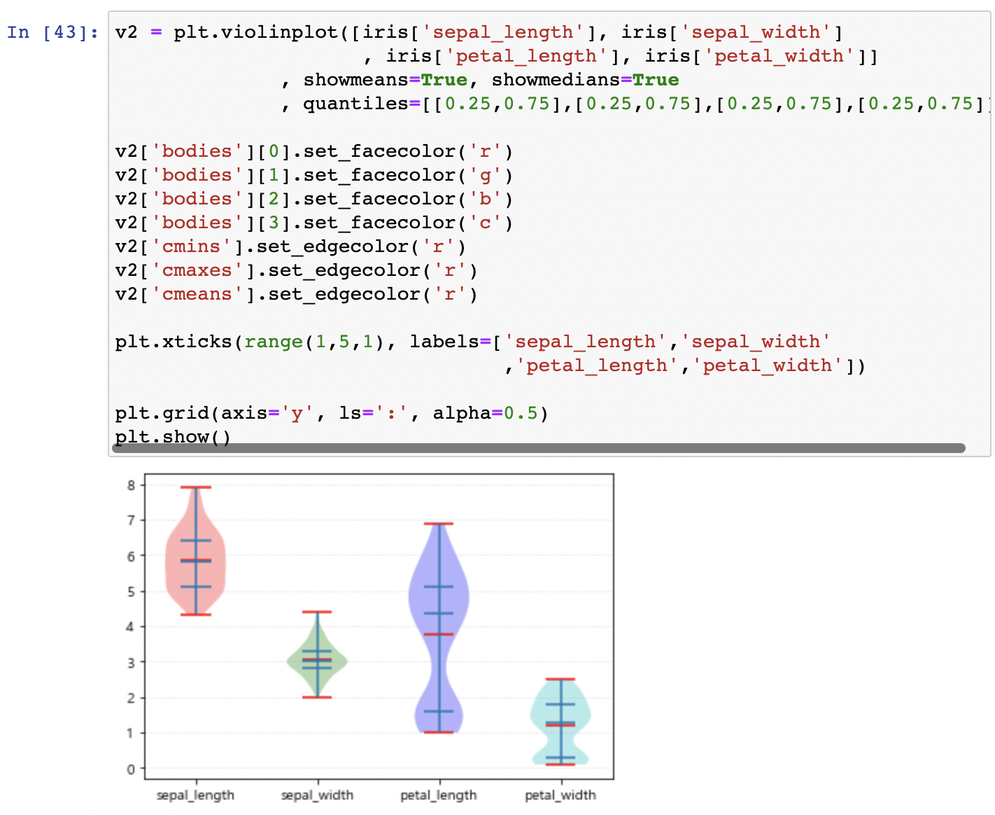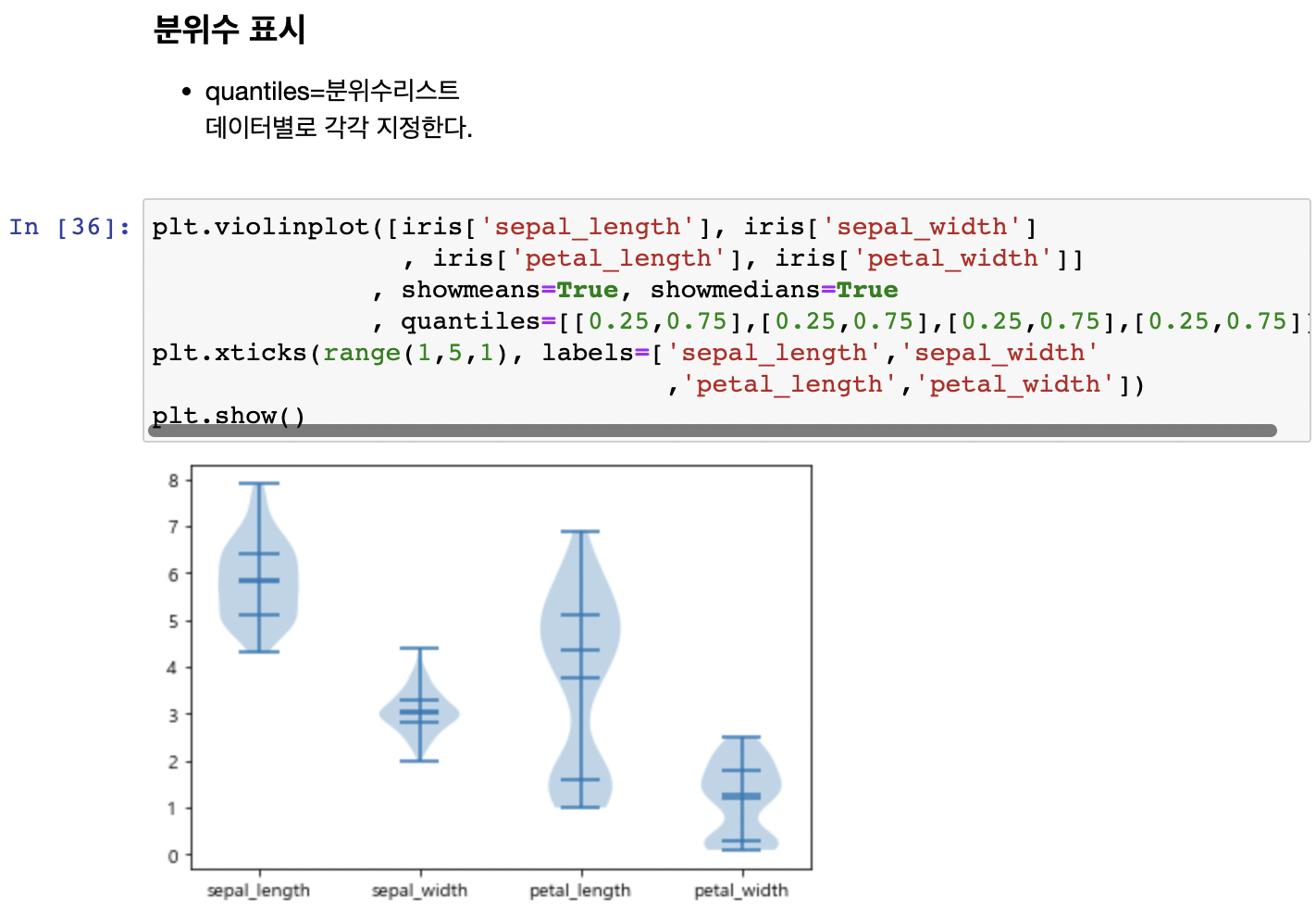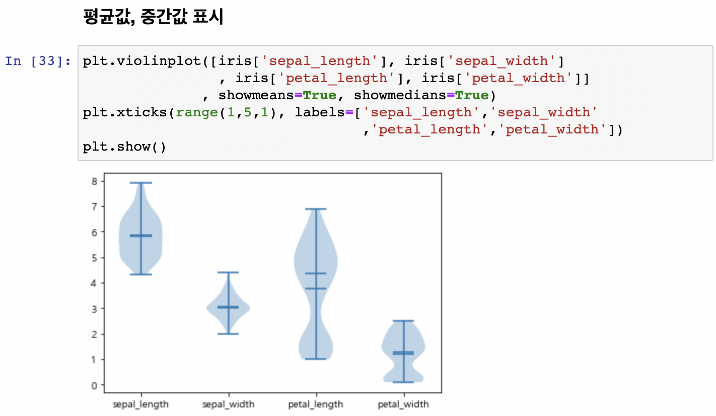 · showmedians=True/False : 중간값에 직선 표시(default:False)